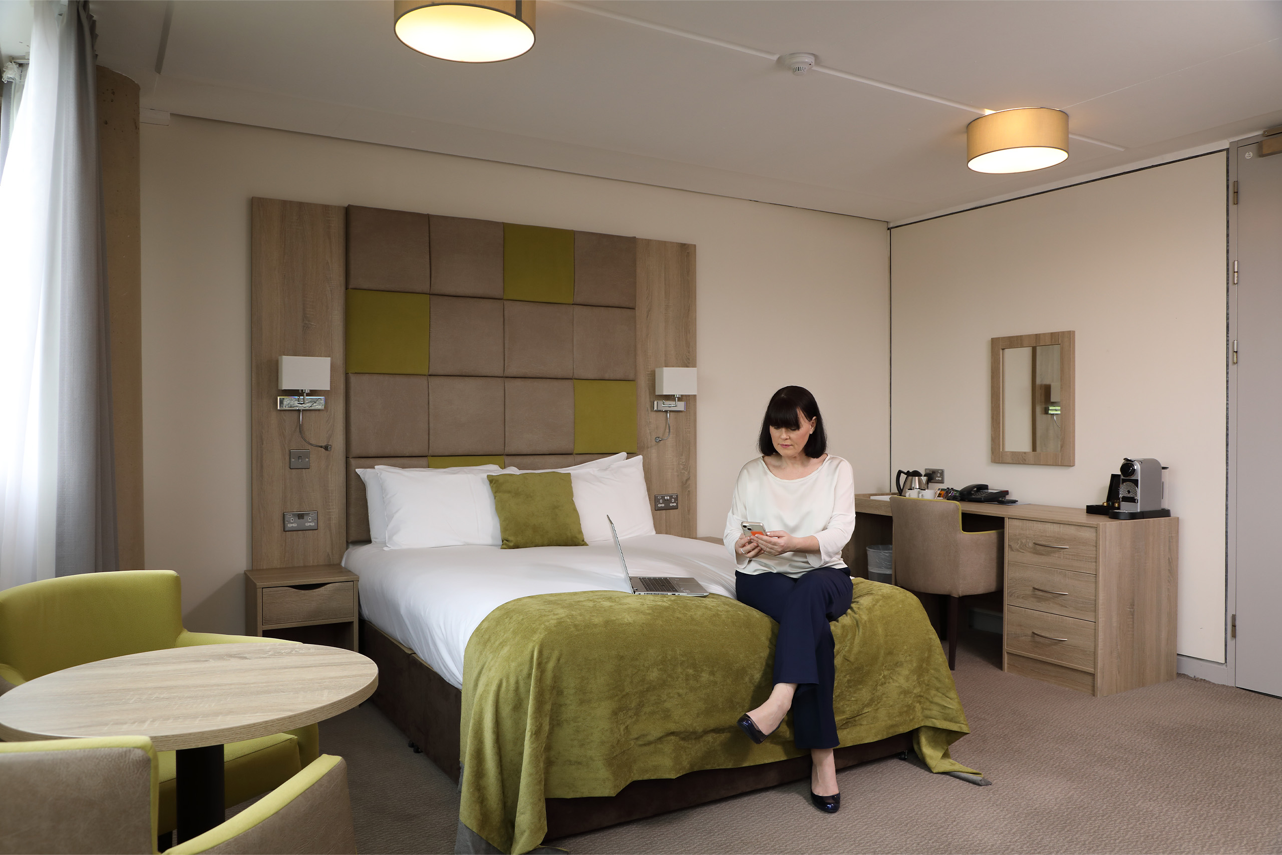 The Orchard Hotel bedroom with woman sat on the bed